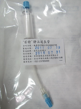 藥品採購資訊 回列表頁面 靜注延長管 藥品代碼 802538 許可證字號 衛署醫器輸字第008627號 BARCODE 085412013718 藥商名稱 百特醫療產品股份有限公司 健保代碼 HFF02C8363BT 藥理分類一 英文品名 EXTENSION SET 藥理分類二 成份及含量 藥理分類三 劑型 檔案下載 仿單 用藥指導單張 藥品安全 管制藥品級別 影音資訊 Video一 Video二 藥品類別 外觀圖檔 圖檔一 圖檔二 圖檔三 適應症 用法用量 副作用 禁忌 注意事項 孕婦用藥分級 儲存條件 其它