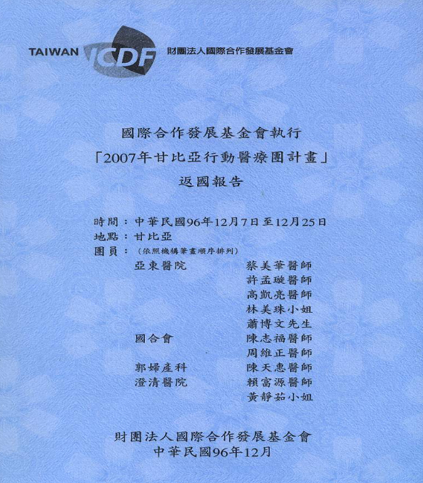 The Hospital has continuously worked with the Taiwan ICDF since 2006 to assist our friendly countries in training medical personnel. In October 2007, a mobile medical team was organized to deliver free medical care in Gambia, and also visit local hospitals. The Hospital expected to upgrade medical care quality with international view and faith.